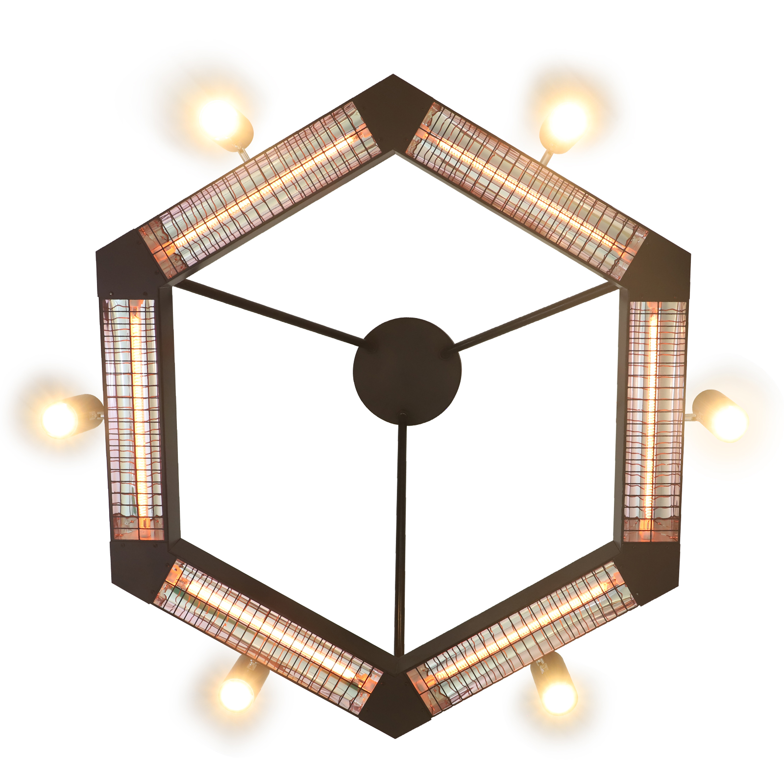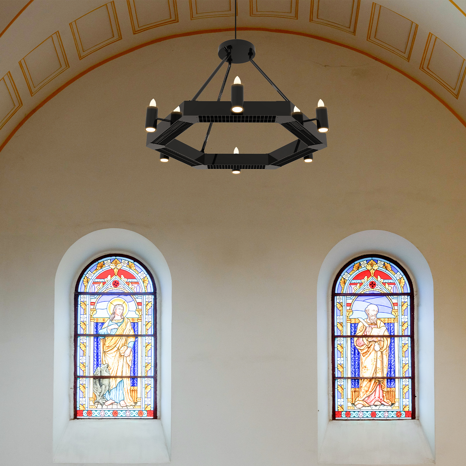 This high-power ceiling-mounted heater combines advanced graphene quartz heating tubes with a sleek metallic polygonal design, making it ideal for churches, cathedrals, and worship halls.
