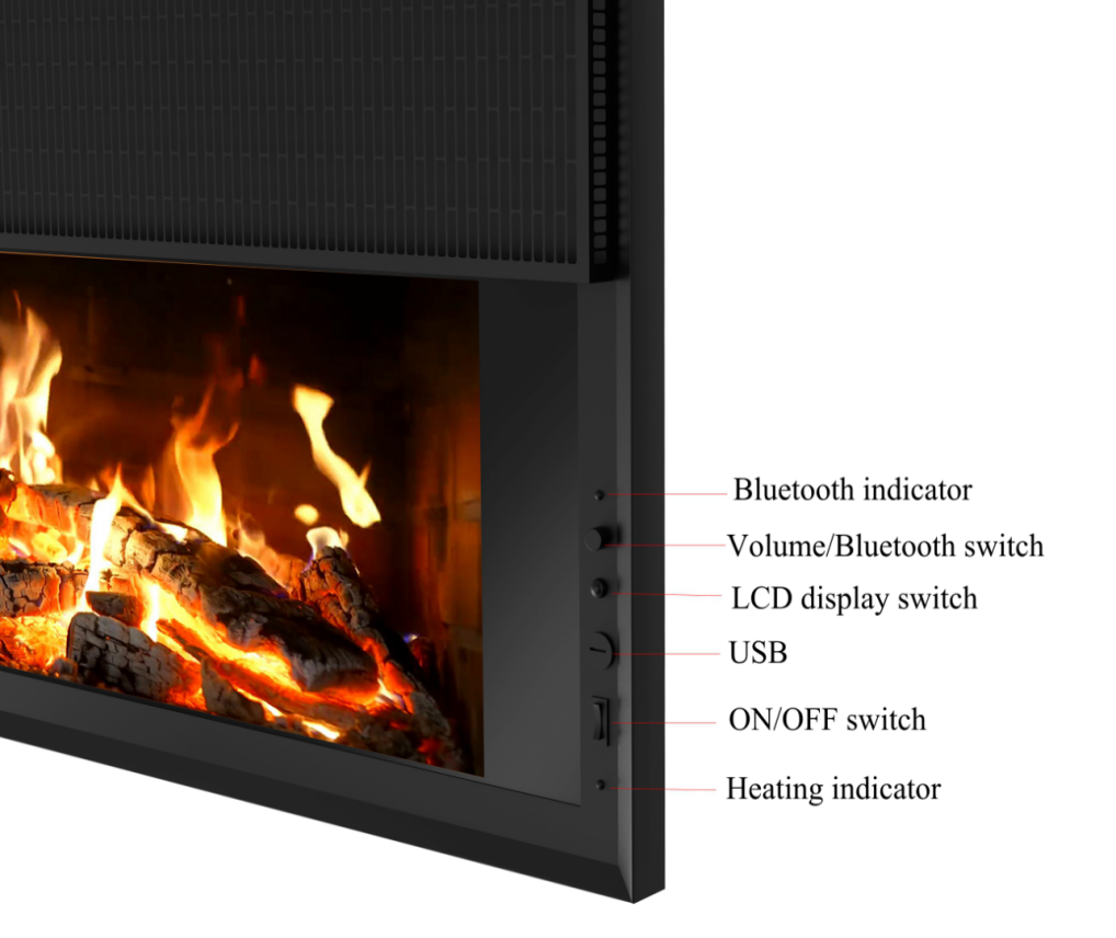 1. LCD Flame Effect: Insert a USB drive with pre-loaded flame videos for a continuous display, or play your own videos for a personalized touch. An optional Bluetooth speaker lets you stream music from your phone for a complete sensory experience.